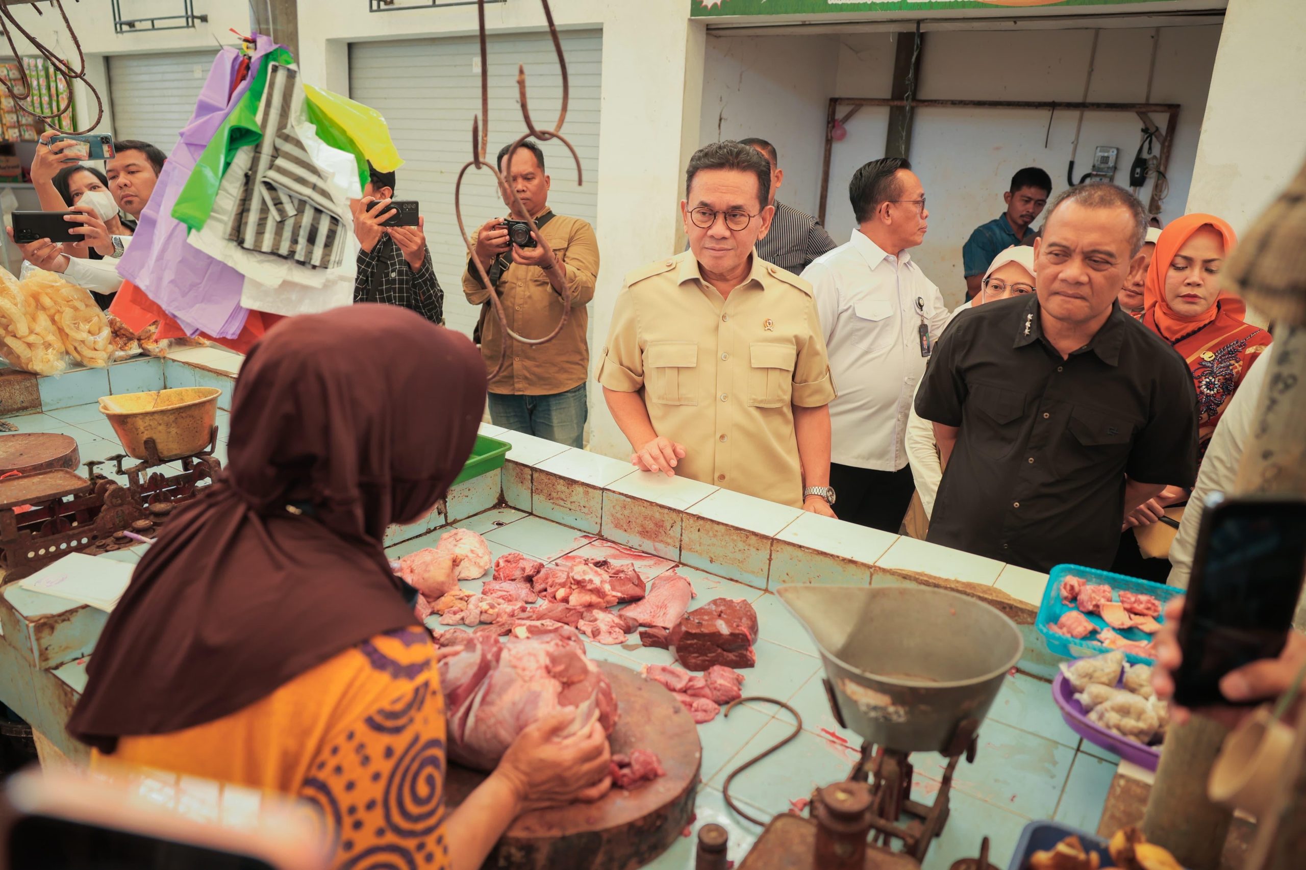 Rombongan Mendag dan Gubernur menyusuri setiap lorong pasar yang sedang ramai dikunjungi pembeli. Keduanya melakukan komunikasi langsung dengan para pedagang, sekaligus memastikan harga berbagai barang pokok mulai dari daging sapi, ayam, beras, minyak goreng, hingga telur.